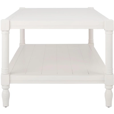 Evoke the charm of coastal cottage style with the Bela Coffee Table in a sleek white painted finish. An inviting combination of form and function, this piece is crafted of pine of artfully turned spindle legs with a slatted top and lower shelf for storage. Care Instructions: Dust regularly with a soft, dry cloth. Never use oiled or treated cloths on lacquered finishes. Some finishes can be wiped with a damp (not wet) cloth, followed at once by rubbing with a dry cloth to remove fingerprints and smudges. For persistent spots, gently clean with a soft cloth and a solution of water and mild soap, make sure to wipe dry. Use adhesive felt pads, coasters and placemats to protect your furniture.