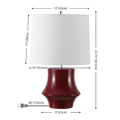 Illuminate your space with the bold and stylish Ryder 22-inch cranberry ceramic table lamp. This eye-catching piece features a rich cranberry hue that adds a pop of color to any room, creating a striking focal point. The finely crafted ceramic body highlights its sleek and smooth finish, offering an elegant touch to your decor. Topped with a soft fabric shade, this lamp diffuses light evenly, setting a warm and inviting ambiance ideal for living rooms, bedrooms, or workspaces. The Ryder lamp not only enhances lighting but also elevates the overall aesthetic of your surroundings. Its timeless design effortlessly blends with diverse interior styles, allowing you to personalize your space with ease. Whether placed on a side table or a desk, this lamp brings both functionality and modern flair to your home, all while showcasing your unique sense of style. Brighten up your day and your decor with the captivating charm of the Ryder 22-inch cranberry ceramic table lamp.