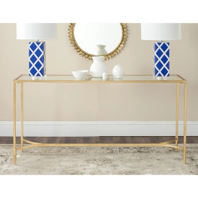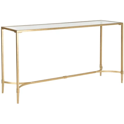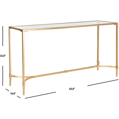 Transform your living space or entryway with the Safavieh Couture Antwan Console. A stunning showcase of modern metal artistry, this piece brings a designer touch to any interior. Crafted from solid iron with a luxurious gilt and lacquer finish, it is topped with sleek tempered glass to create a light, airy, yet durable focal point for your home.