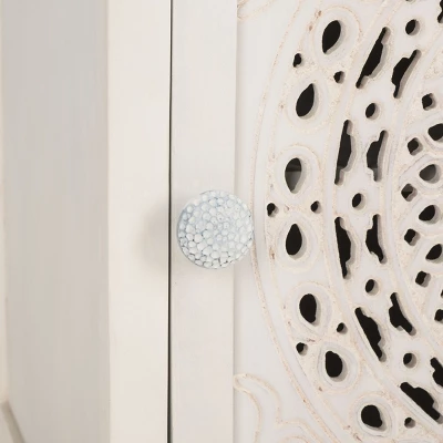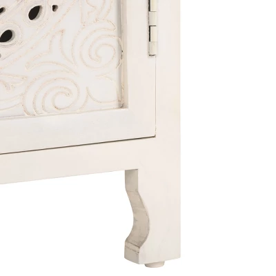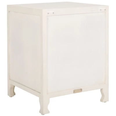 Elevate your bedroom sanctuary with the Safavieh Regius Nightstand. This exquisite piece combines the rustic charm of authentic mango wood with a sophisticated, hand-carved Mandela-inspired facade. Designed to be more than just furniture, this side table serves as an artistic focal point, blending eclectic patterns with a serene white-washed finish that complements both modern and bohemian interiors.